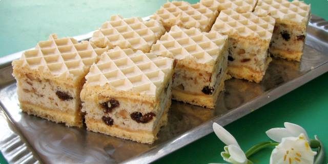 Sastojci:dvije oblatne.Za biskvit:,9 bjelanjaka,37 dag šećera (kristal),18 dag margarina,15 dag rezanih oraha,15 dag suhih grožđica,22 dag brašna
