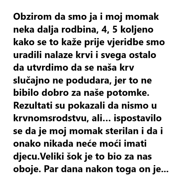 Obzirom da smo ja i moj momak neka dalja rodbina, 4, 5 koljeno kako se to kaže prije vjeridbe smo uradili nalaze krvi i svega ostalo da utvrdimo da se naša krv slučajno ne podudara, jer to ne bibilo dobro za naše potomke. Rezultati su pokazali da nismo u krvnomsrodstvu, ali… ispostavilo se da je moj momak sterilan i da i onako nikada neće moći imati djecu.