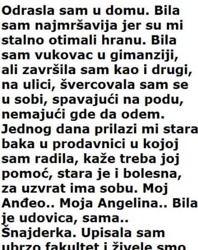 Moj Anđeo.. Moja Angelina.. Bila je udovica, sama.. Šnajderka. Upisala sam ubrzo fakultet i živele smo od mojih privatnih časova i bakine male penzije. Ali ne i od snova. Dala mi je sve, a najviše ljubavi. Mog anđela više nema, ali sada sam ponosna mama malog anđela koji nosi njeno ime. Hvala ti bako…