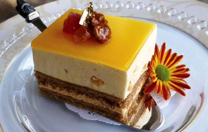 230 + 40 g šećera, 120 g bjelanaca, 12 listova želatina, 550 ml soka od narandže, 500 g šlaga, 100 g mango-pirea i 100 g kandirane narandžine kore.