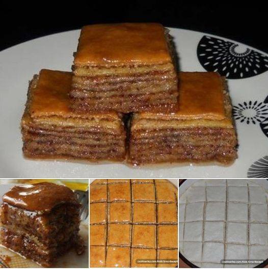 Poklopite drugom, tanko razvaljanom korom. Opet pospite smjesom od oraha i šećera. Postupak ponavljajte, dok se sastojci ne utroše. Posljednju koru ne posipajte filom. Izrežite na kocke, pa ostavite da miruje 20-tak minuta.