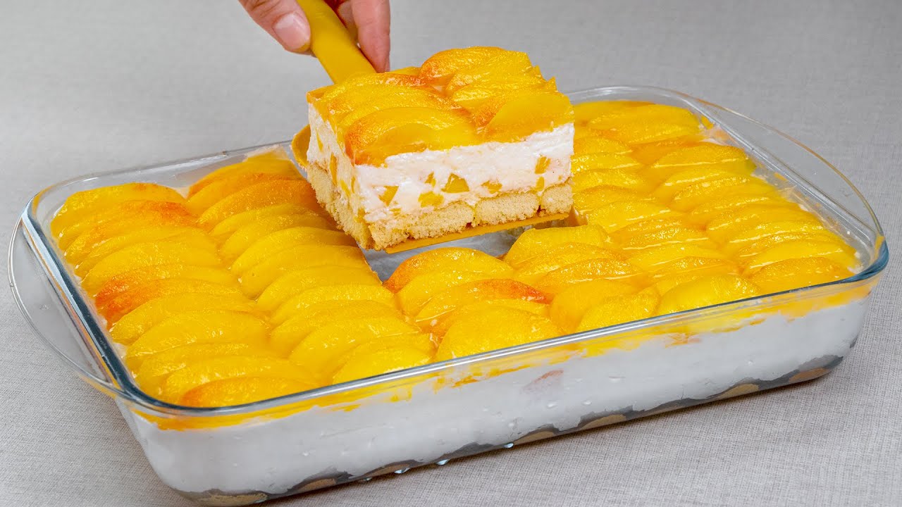 200 g piškota,200 ml mleka.Za fil:500 ml slatke pavlake,100 g šećera u prahu,200 g breskvi.Za dekoraciju:300 g breskvi,250 ml hladne vode,15 g želatina.
