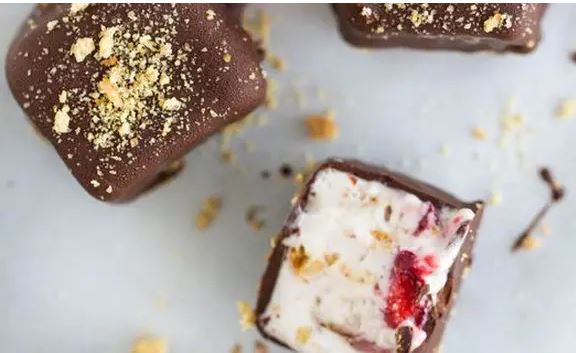 Zamrznite pleh sa smjesom na 4-6 sati ili dok se potpuno ne zamrzne.U maloj posudi otopite tamnu čokoladu dok ne postane glatka i tekuća.Izvadite zamrznuti sladoled iz pleha pomoću papira za pečenje i izrežite ga na željenu veličinu kocki.