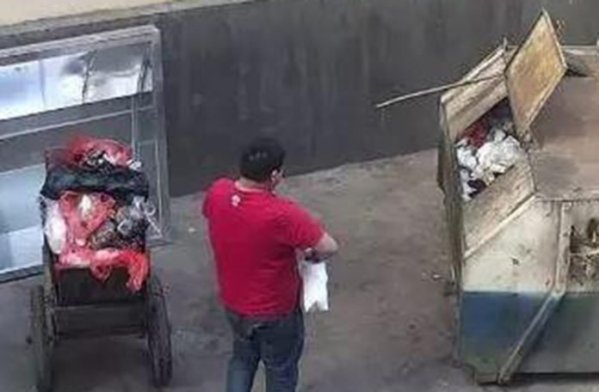 Na snimku se vidi kako muškarac u crvenoj majici i papučama nosi nešto u ruci, a u sljedećem trenutku baca zamotuljak u kontejner. Poslije toga stavlja ruke u džepove pantalona i polako odlazi, kao da se ništa nije desilo.