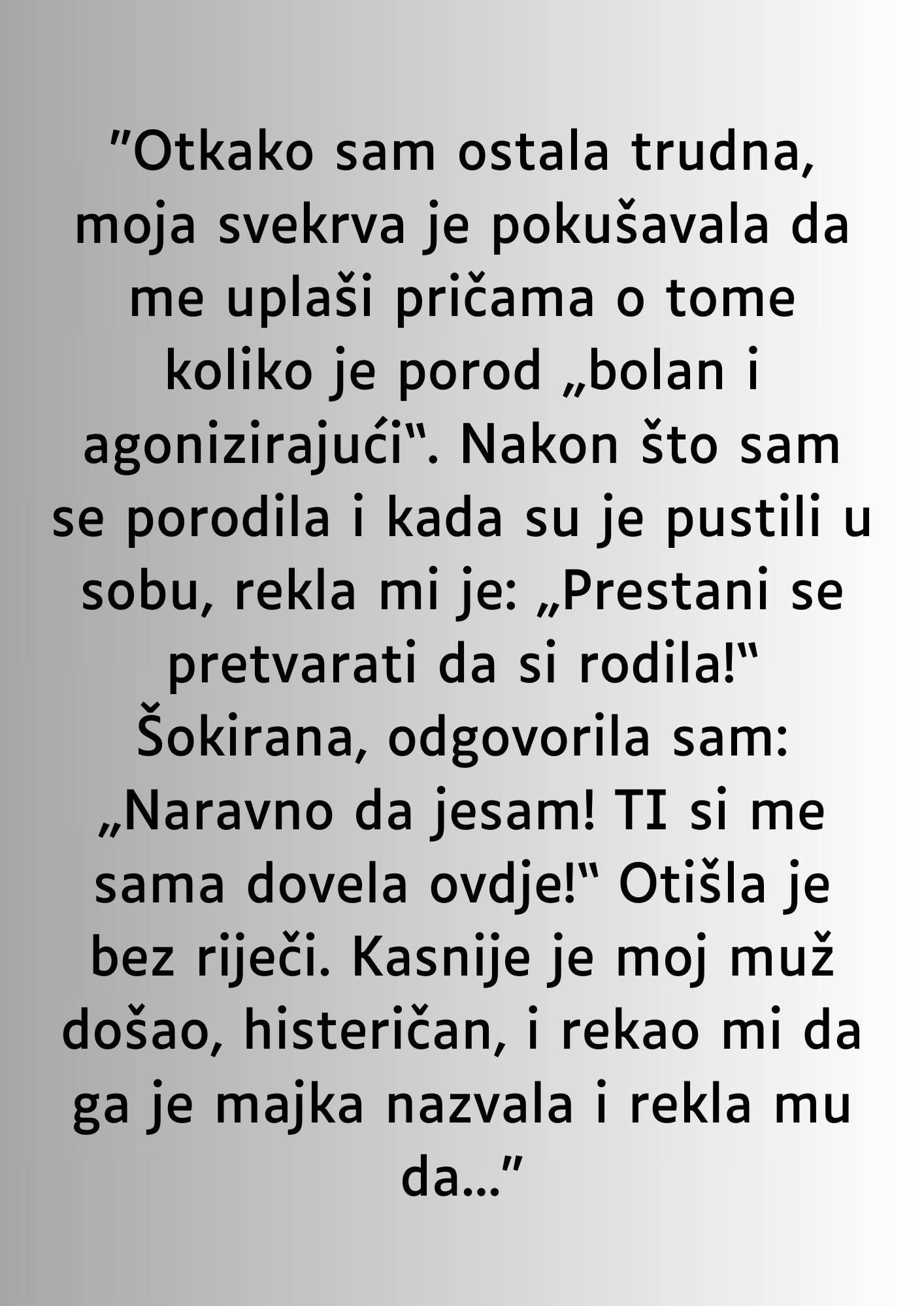 “Otkako sam ostala trudna, moja svekrva je pokušavala da me uplaši pričama o tome koliko je porod „bolan i agonizirajući“. Nakon što sam se porodila i kada su je pustili u sobu, rekla mi je: