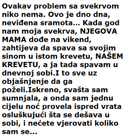 “Ovakav problem sa svekrvom niko nema. Ovo je dno dna, neviđena sramota… Kada god nam moja svekrva, NJEGOVA MAMA dođe na vikend, zahtijeva da spava sa svojim sinom u istom krevetu, NAŠEM KREVETU, a ja tada spavam u dnevnoj sobi.