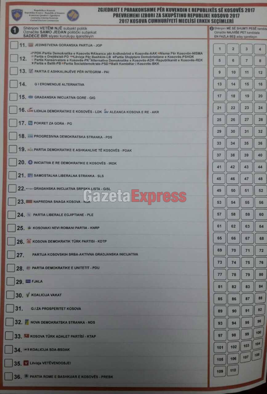 Centralna izborna komisija je prezentovala dizajn glasačkog listića za prijevremene parlamentarne izbore zakazane na Kosovu 11. juna 2017.godine.