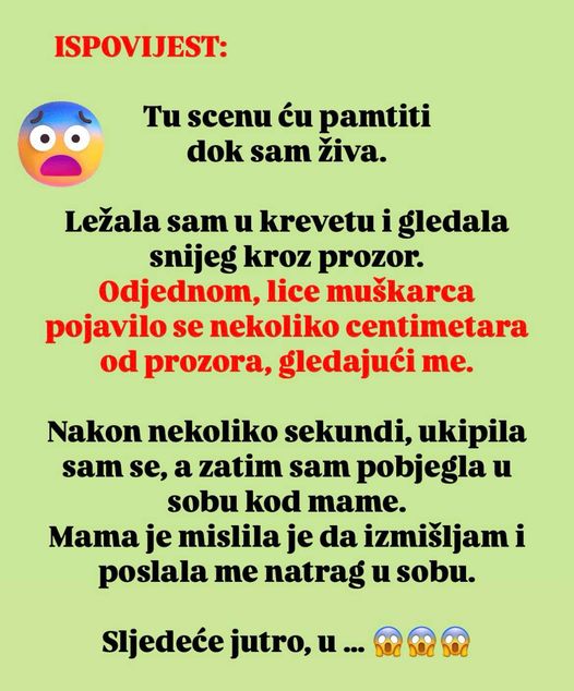 — Ležala sam u krevetu i gledala snijeg kroz prozor. Odjednom, lice muškarca pojavilo se nekoliko centimetara od prozora, gledajući me. Nakon nekoliko sekundi, ukipila sam se, a zatim sam pobjegla u sobu kod mame. Mislila je da izmišljam i poslala me natrag u sobu. Sljedeće jutro, u snijegu su bile otiske stopala koje su išle do mog prozora.