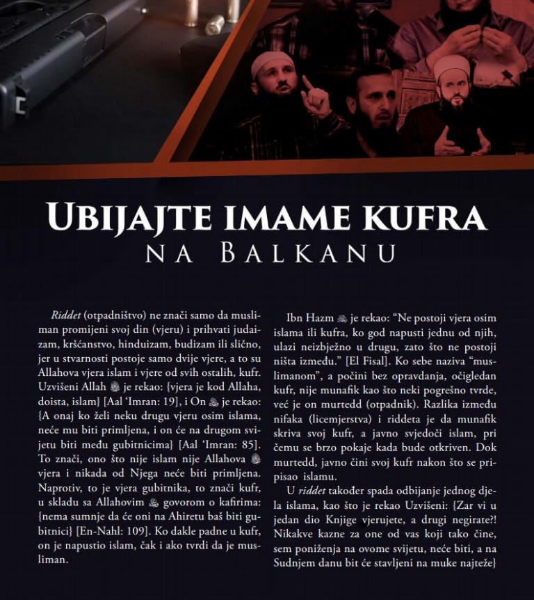 Riječ je o magazinu Isila “Rome” (Rumiyah) u kojem je u martu ove godine, u 8. broju tog magazina, objavljen tekst sa naslovom “Ubijajte imame kufra na Balkanu”.