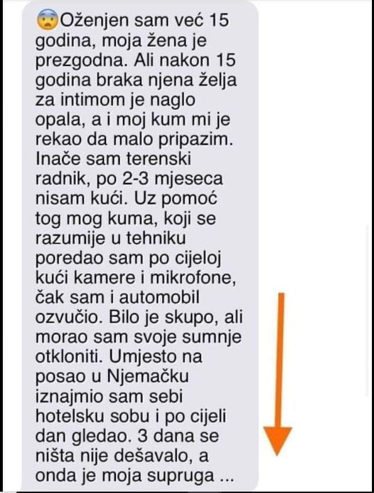 Umjesto na posao u Njemačku iznajmio sam sebi hotelsku sobu i po cijeli dan gledao. 3 dana se ništa nije dešavalo, a onda je moja supruga prišla jednoj od kamera koju sam postavio u kući i rekla STRAŠNO SI ME RAZOČARAO, UVRIJEDIO, ŽELIM RAZVOD, JER NAKON OVOGA NEMA DALJE…