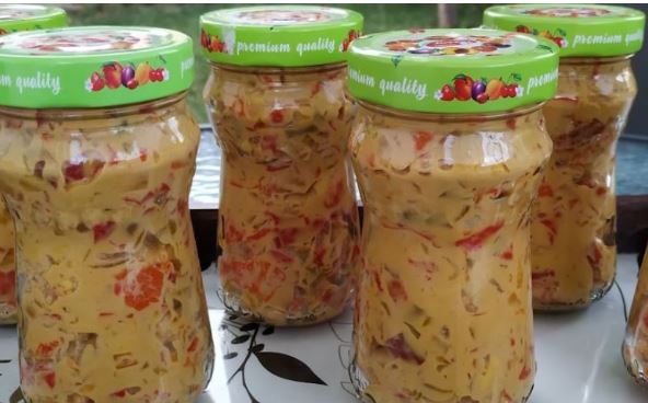 Priprema: Papriku iseckati, kao i crni i beli luk. U jednu posudu dodati vodu, sirće, šećer, so i ulje pa kada provri dodati povrće i sve kuvati oko pola sata. Procediti i izmešati sa senfom.
