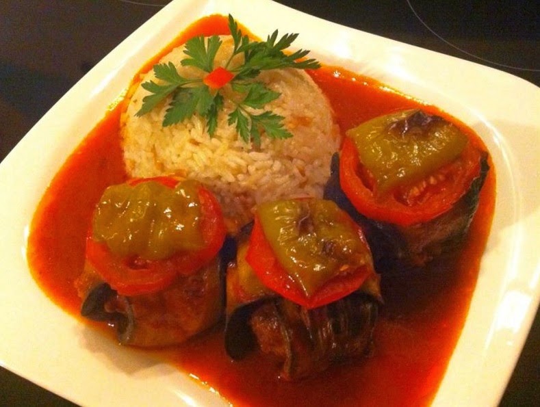 - Svaku uvijenu ćufticu prekriti sa šnjiticom paradajza, zatim komadićem paprike, kao što je na slici.