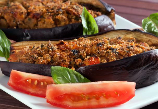 Izdubljene patlidžane stavite u posudu obloženu papirom za pečenje i premažite s malo maslinova ulja. Nadjenite pripremljenim nadjevom pa pospite ribanim sirom. Pecite u zagrijanoj pećnici na 190 °C oko 30 minuta. Pečene patlidžane pustite da odstoje desetak minuta prije posluživanja. Poslužite s kiselim vrhnjem posutim vlascem.