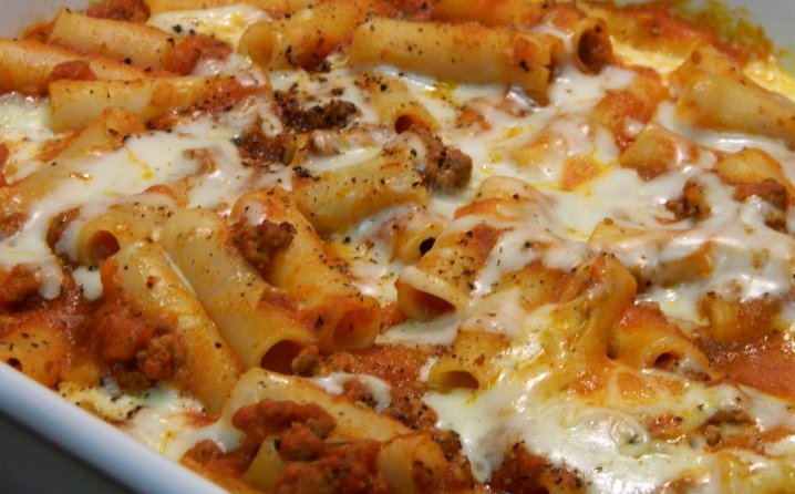 Makarone skuhati prema uputama s vrećice i ocijediti. Luk propržiti u šerpi, na masnoći, zatim dodati mljeveno meso i pržiti dok ne dobije smeđu boju. Umiješati paradajz sos i sol. Polovinu pripremljenih makarona staviti u pleh premazan uljem, pa preko njih posuti pripremljenu meso u sosu. Zatim 50 gr parmezana posuti preko mesa, pa dodati i preostale makarone. Mlijeko kuhati u šerpi sa maslacem dok se maslac ne istopi, pa ½ ove smjese umiješati s umućenim jajima i vratiti u šerpu s mlijekom. Mješavinu mlijeka, jaja i maslaca preliti preko makarona, posuti preostalim sirom i peći oko 50 minuta na 170 °C.