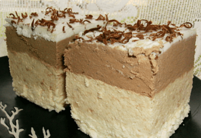 Zeljeni kalup obloziti papirom za pecenje (lakse se reze i vadi kolac iz kalupa) pa u kalup sasuti masu sa kokosovim brasnom (opet lakse je izvaditi kolac jer je masa dosta cvrsca nego masa sa cokoladom ili keksom) poravnati masu i sasuti preostale dvije mase.Kolac ostaviti u frizider na hladenje barem 3 – 4 h ili u zamrzivac na 2 h. Ohladjen kolac premazati slag pjenom ili slatkim tucenim vrhnjem. Ukrasiti po zelji.