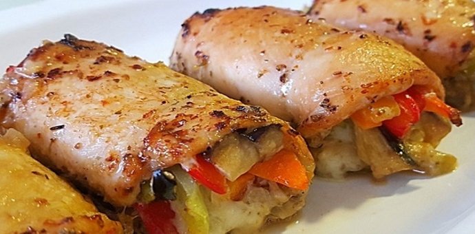 2. Povrće oprati i isjeći na tanke štapiće. Tanko i kačkavalj. Pileće filete povaditi na jedan tanjir. Ostanak sosa istresti u posudu u kojoj će se piletina peći. Na sredinu svakog pilećeg fileta staviti od svakog povrća po 2-3 štapića, i 2-3 štapića kačkavalja. Zarolati i slagati u posudu sa sosom. Kada završite rolanje dodajte pola fidžana vode i pecite na 250 stepeni tek toliko da odozgo blago porumeni. Nemojte prepeći jer što se duže peče to će piletina biti suvlja.