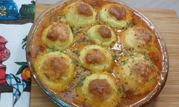 Kada se sve skrčka, vratite u taj sos piletinu i sve izmešajte. Preručite sve u vatrostalnu činiju, a potom od pire krompira pravite loptice koje ćete staviti po vrhu smese. Zapecite sve u rerni, pospite sa još malo kačkavalja i peršuna i poslužite toplo.
