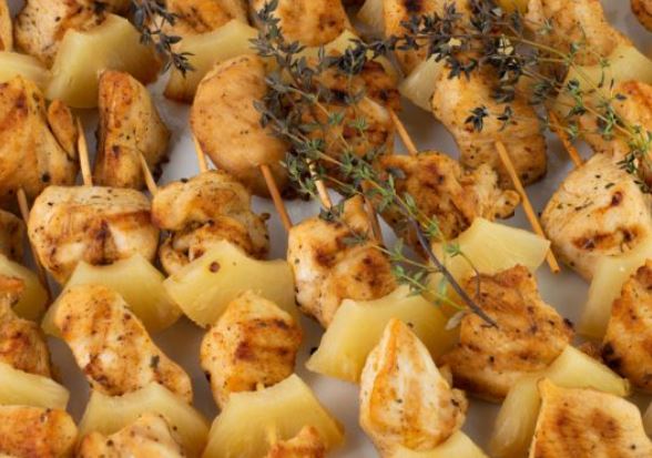 Priprema:Meso, paprike i ananas isecite na kockice. U tiganj prvo ubacite ananas, propržite ga, pa izvadite na tanjir. Potom isto uradite s mesom. Paprike takođe propržite, a onda ih poklopite i nastavite da dinstate. Kad budu izgledale kao skuvane, dodajte u tiganj piletinu i ananas, iseckane začinske biljke i so. Promešajte i još malo prodinstajte. Služite uz baren pirinač.