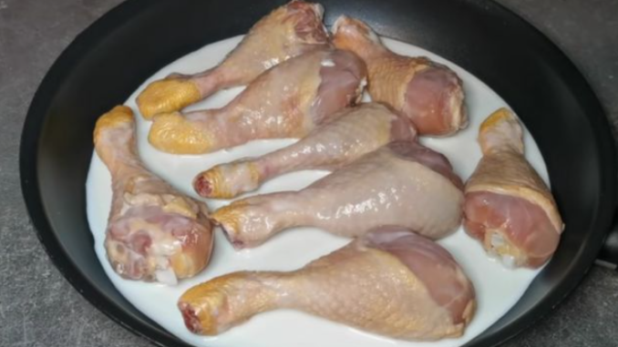 Priprema:Piletinu poređajte u dublji tiganj i prelijte je prvo mlekom, a onda dodajte vodu i čen belog luka. Posolite i pobiberite, i stavite poklopljeno na tihu vatru da se krčka oko 20 minuta.