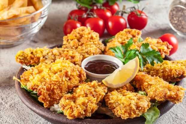 Komade piletine uvaljajte u brašno, zatim u umućena jaja s mlijekom te na kraju u začinjeni cornflakes. Piletinu poredajte na lim i pecite 20-ak minuta dok ne dobije lijepu boju. Poslužite uz pomfrit, umak i salatu po želji.