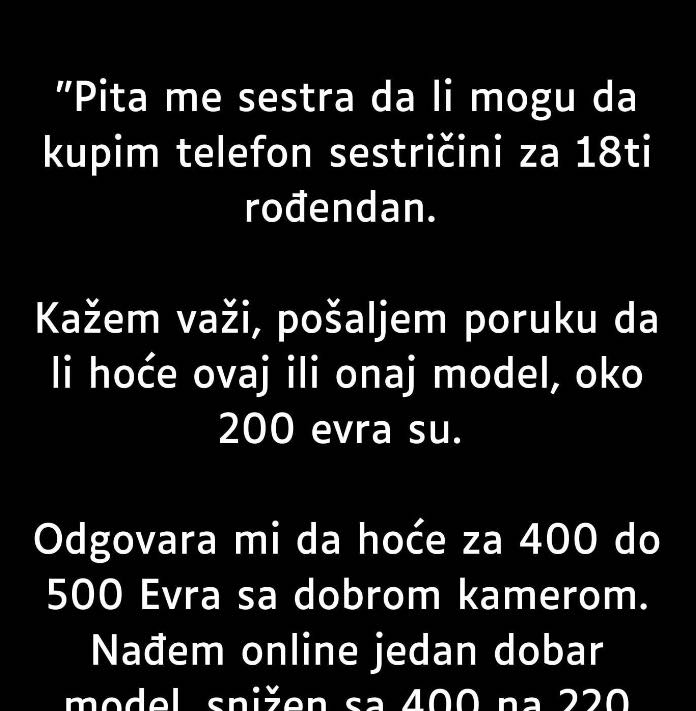 “Pita me sestra da li mogu da kupim telefon sestričini za 18ti rođendan.