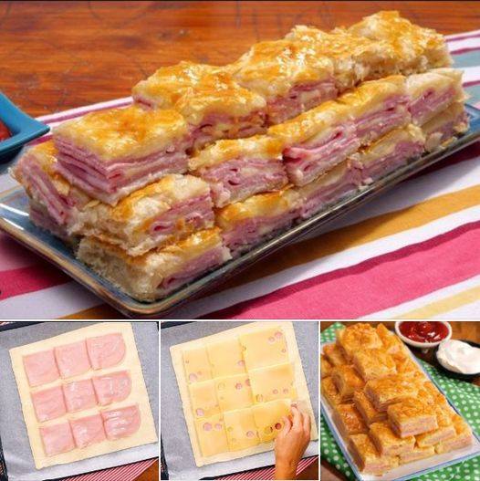 Sir podelite na 2 jednaka dela po 200 g. Jedan deo izrendajte, a drugi isecite na tanke kvadrate. Lisnato testo stavite na pleh obložen pek papirom. Zatim preko stavite šunku, pa kriške sira, opet šunku i rendani sir. Pokrijte drugim slojem testa. Viljuškom pritisnite krajeve, a onda zasecite u obliku dijamanta. Premažite umućenim jajetom. Pecite u zagrejanoj rerni na 180°C oko 25 minuta. Kada se prohladi isecite kocke.
