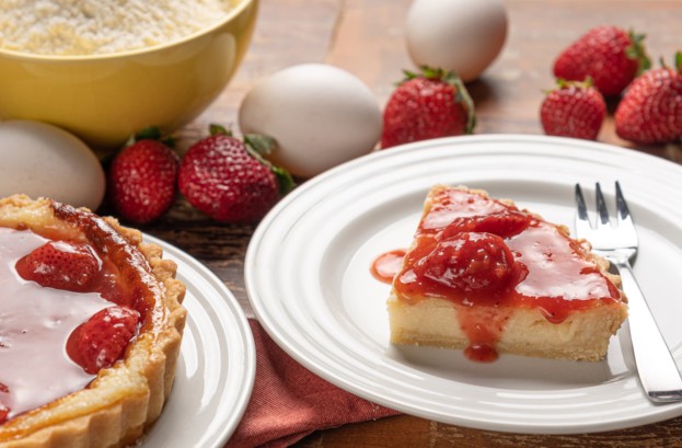 U drugoj zdjeli pomiješajte žumanjke, šećer i gustin pa dodajte vruće mlijeko i kuhajte dok se ne zgusne. Umiješajte maslac. Ohlađenu kremu rasporedite po tijestu, posložite jagode i premažite zagrijanim džemom. Hladite dva sata prije posluživanja.