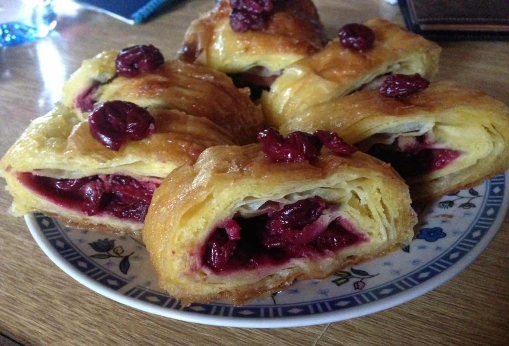 U zavisnosti koliko kora ima toliko ćete imati rolata. Meni uglavnom ispadne 4 rolata. Odvojite po 4 kore ili po 5 za jedan rolat – pa na svaku koru namazati fil i na zadnju isto fil pa višnje. Urolati. (višnje stavljate po želji od 300 g do 500 g koliko volite) Peći na 200C.Kada lepo porumeni. Ostaviti da se rolati ohlade. Kada se ohlade napraviti preliv od: 2 čaše vode i 2 čaše šećera kuvati šerbet. Preliti preko rolata.