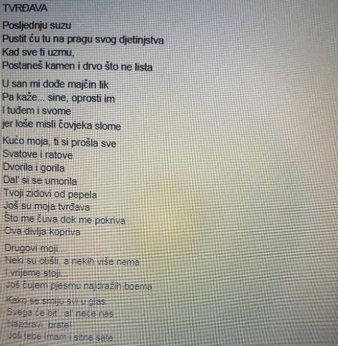 – Geronimo me zna u dušu, dosta se privatno družimo i mislim da smo dobar tandem. Kada je u pitanju pjesma “Tvrđava” ona stvarno je odlična. Tekst i melodija su malo teški, ali to je pjesma za sva vremena. Od nekoliko kolega sam dobio pohvale za tekst i svi vjeruju da će ona u mojoj izvedbi postati veliki hit i biti nasljednica “Ja bez tebe ne mogu da živim” – kaže Bešlić.