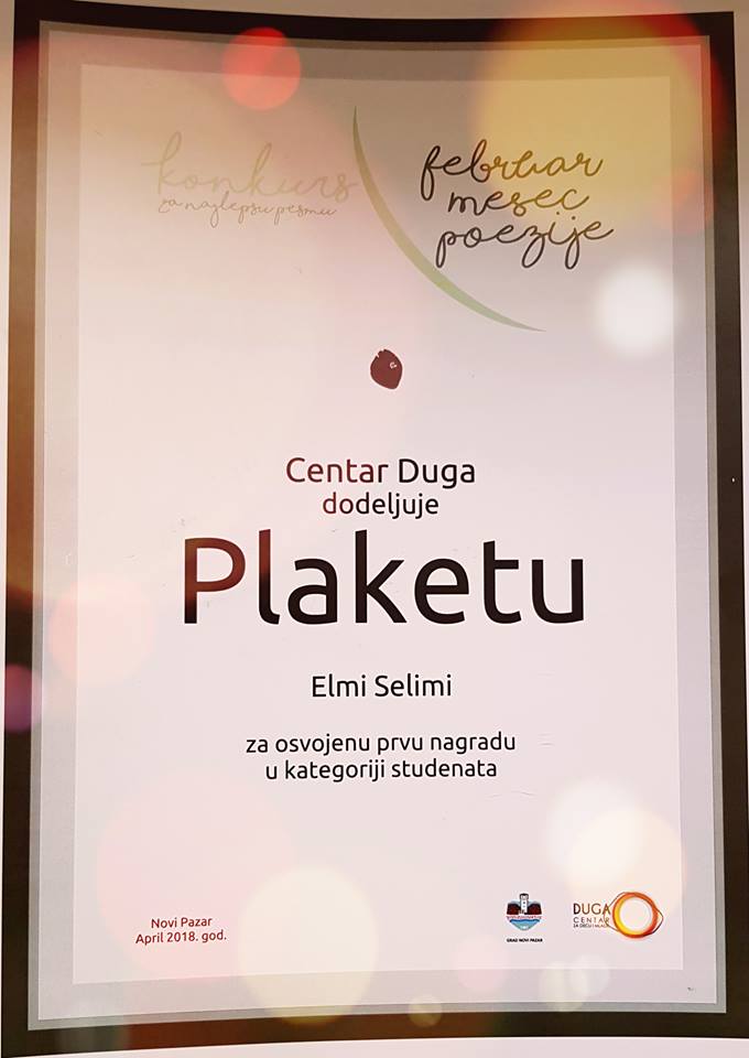 Ustanova za djecu i omladinu „Duga“ na konkursu za „Najbolju pjesmu “ za 2018. godinu dodjelila je pobjedničku nagradu pjesnikinji i studentu medicine i psihologijeElmi Selimi u kategoriji studenata.