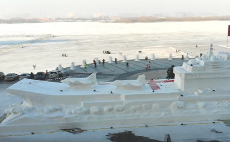 Kineska televizija pokazala je reportažu o nosaču aviona, izrađenom od snijega u Harbinu.