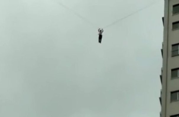 Međutim, precijenio je svoje akrobatske mogućnosti. Na snimci se vidi kako visi s visine od 60 metara i jedva se drži za kabel. Na sreću, policija je uz pomoć vatrogasaca uspjela reagirati na vrijeme.