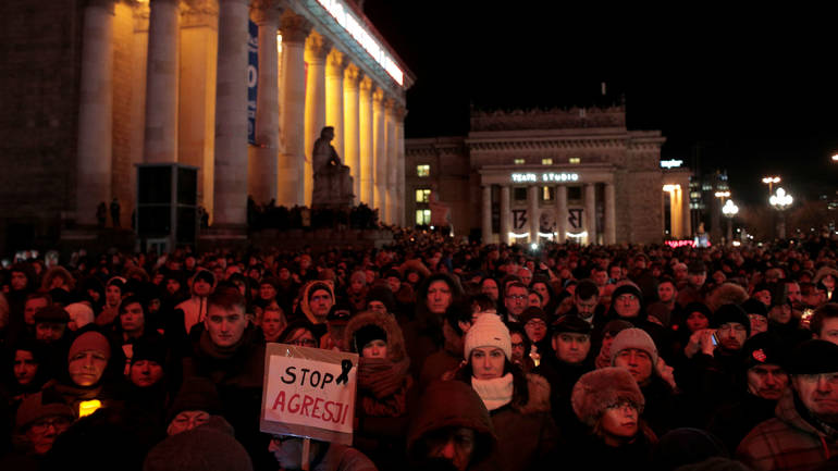 U celoj zemlji okupljaju se ljudi kako bi odali počast tragično nastradolom gradonačelniku Gdanjska i njegovoj porodici i kako bi se suprostavili mržnji i nasilju.