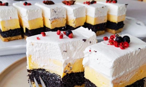 Napravite biskvit.Bjelanjke izradite u čvrsti snijeg i postupno im dodajte šećer i vanilin šećer. Na kraju dodajte i mljeveni mak pomiješan s praškom za pecivo i lagano promiješajte kuhačom.