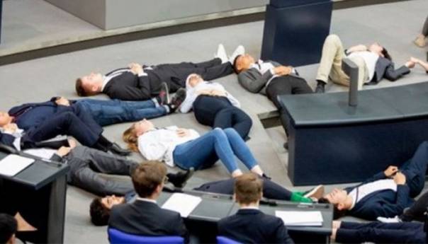 U trenutku kada je predsjednik parlamenta Wolfgang Schäuble dao znak za početak sjednice, aktivisti koji se bore za klimatske uslove, legli su nasred sale i pravili se mrtvi, kako bi ukazali na klimatske probleme i nezainteresovanost parlamenta za pronalazak rješenja.