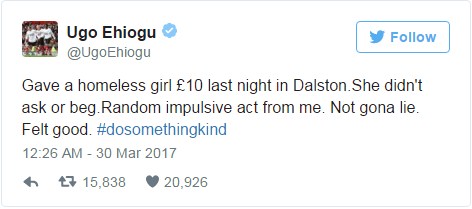 – Dao sam sinoć jednoj mladoj beskućnici deset funti u Dalstonu. Nije tražila, nije prosila. Prosto mi je došlo da joj dam, neću da lažem. I, ojsetio sam se dobro. #UraditeNeštoLepo”, napisao je Ehiogu, poslije čega se nije više oglašavao na ovoj društvenoj mreži.