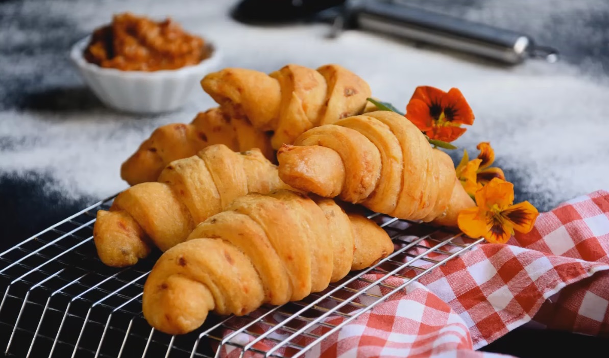 Nadošlo tjesto razvucite na pobrašnjenoj radnoj površini. Isecite na 16 djelova i uvijte u kiflice kao što je prikazano u videu.