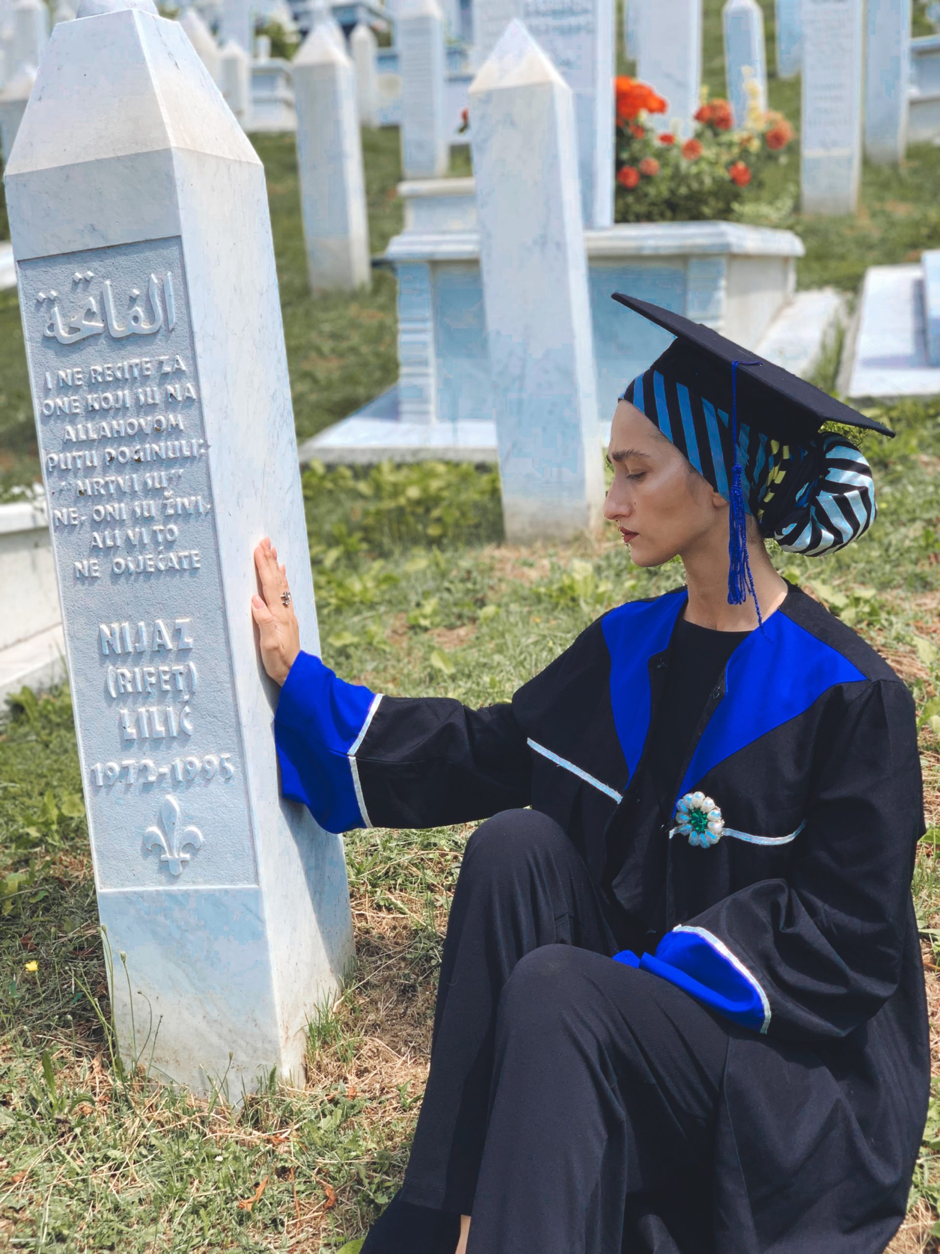 Djevojka po imenu Nejra Lilić je ponosno stala pored mezara svoga oca u Srebrenici. Diplomirala je i došla da kaže svome ocu.