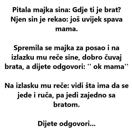 Spremila se majka za posao i na izlazku mu reče sine, dobro čuvaj brata, a dijete odgovori: ′′ ok mama ′′