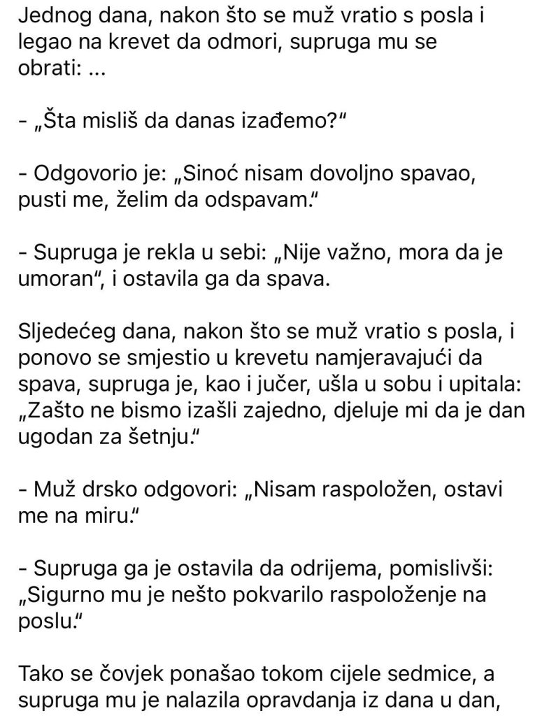 Jednog dana, nakon što se muž vratio s posla i legao na krevet da odmori, supruga mu se obrati: …