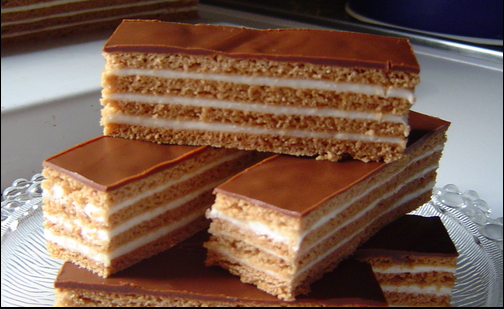 Tijesto:1 cijelo jaje,150 g šećera,1 žličica sode bikarbone,50 g margarina,2 žlice mlijeka,2 žlice meda,450 g glatkog brašna,1 žlica kakao.Krema:4 dl mlijeka,2 i 1/2 žlice glatkog brašna,2 žlice šećera,1 vanilin šećer,2 žlice mljevenog šećera (ne prepune),150 g margarina.Čokoladna glazura:100 g čokolade za kuhanje,3 žlice ulja.