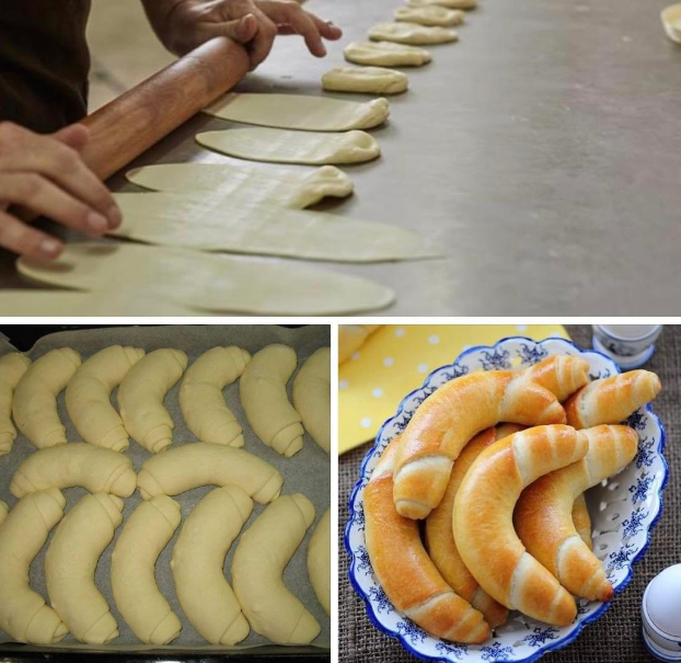 Ostaviti ga na toplom mestu da se udvostruci. Radnu povrsinu blago posuti brasnom, istresti nadoslo testo, lagano ga premesiti a zatim podeliti na 30-ak delova. Svaki komadic testa oblikovati u lopticu i sloziti na radnu povrsinu. Uzeti jednu lopticu, oklagijom je razviti po duzini a zatim urolati u kiflicu. Oblikovane kifle slagati u pleh oblozen papirom za pecenje tako da spoj lezi na dnu. Ostaviti slozene kiflice u plehovima dok se rerna zagreva. Rernu ukljuciti da se zagreje na 200 stepeni. Zumance razmutiti sa toplom vodom, premazati nadosle kiflice i peci, u zagrejanoj rerni, 12-15 minuta ili dok ne porumene.