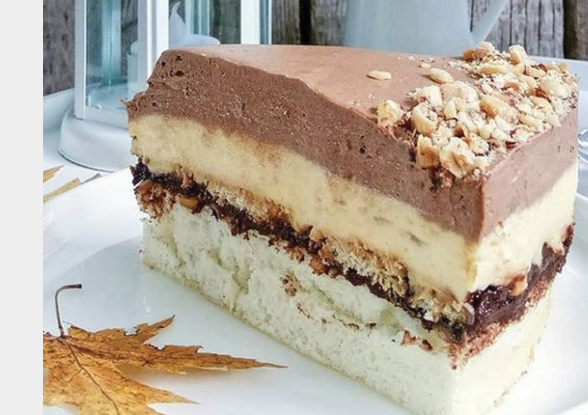 Koru okrenite tako da vam lješnjaci budu gore. Premažite ih Nutellom. Stavite žutu kremu, a zatim preko nje poredajte petit keks. Nakon toga dodajte čokoladnu kremu. Ostavite tortu na dva sata da se hladi u hladnjaku. Kada se stegne, ukrasite je po želji šlagom ili kremom od vanilije ili je jednostavno prelijte istopljenom crnom čokoladom.