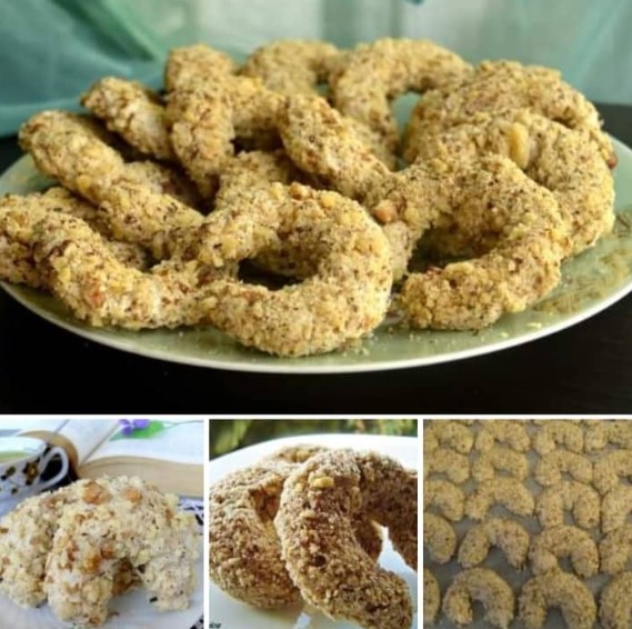 Praviti male kiflice i valjati u sjeckane orahe, redati u pleh i peči na 100-120 stepeni 30-40 minuta.