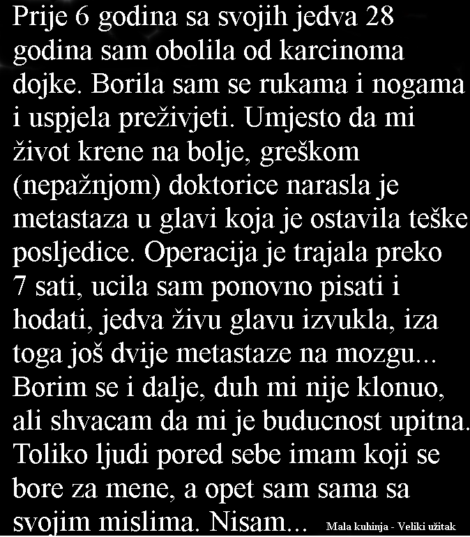 Prije 6 godina sa svojih jedva 28 godina sam obolila od karcinoma dojke. Borila sam se rukama i nogama i uspjela preživjeti. Umjesto da mi život krene na bolje, greškom (nepažnjom) doktorice narasla je metastaza u glavi koja je ostavila teške posljedice. Operacija je trajala preko 7 sati, učila sam ponovno pisati i hodati, jedva živu glavu izvukla, iza toga još dvije metastaze na mozgu. Borim se i dalje, duh mi nije klonuo, ali shvaćam da mi je budućnost upitna.