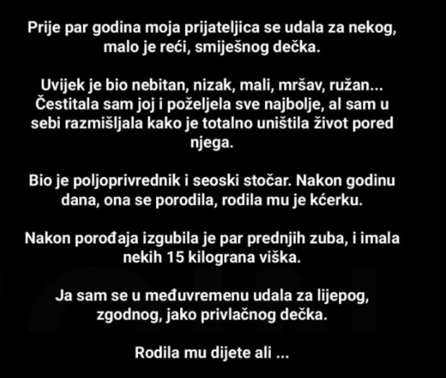 Ja sam se u međuvremenu udala za lijepog, zgodnog, jako privlačnog dečka. Rodila mu dijete I dobila nekih 7 kilograma viška. Nju je njen muž tretirao kao…