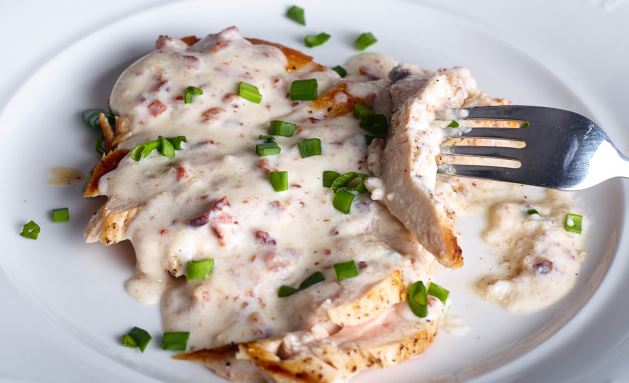 Posolite i popaprite po ukusu. Ravnomjerno rasporedite po mesu mješavinu sira i vrhnja. Pecite u zagrijanoj pećnici oko 20 minuta ili dok piletina nije potpuno pečena, a sir lijepo zlatnosmeđ. Poslužite pečene filee piletine s četiri vrste sira i vrhnjem tople uz prilog po želji, poput kuhane riže, pečenog povrća i salatu.