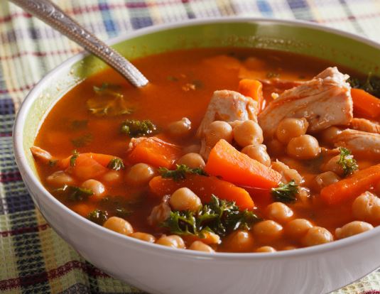 Dodajte rajčice, temeljac, bosiljak, lovor, pastu od rajčice i mljevenu papriku. Ponovno vratite prsa i ostavite da se krčka oko pola sata. Ubacite slanutak i kuhajte još deset minuta. Na kraju pospite svježim začinskim biljem i poslužite toplo.