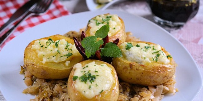 U svaki krompir stavite po kašiku maslaca, začinite sa malo soli i bibera. Dodajte malo dimljene slanine, dimljenog mesa i stišnjene šunke, malo sira.