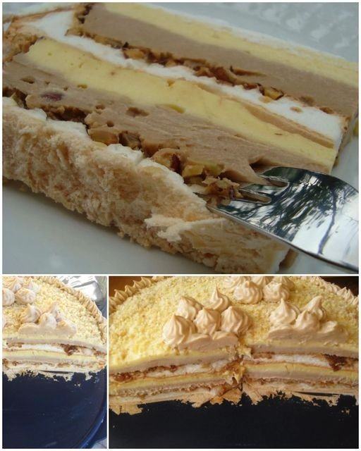 Kremu podijeliti na pola, u jednu polovicu dodati 2 vanilij šećera i rastopljenu bijelu čokoladu, a u drugu polovicu dodati rastopljenu čokoladu sa lješnjacima i čokoladu za kuhanje.